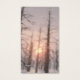 Un soleil d'hiver pâle se couche derrière des mélèzes imposants comme des sentinelles sombres. Leurs branches grillées, nues, sauf pour un piqué de neige, et les dorures pastel, roses et bleus du ciel couché de soleil sont vus comme à travers une brume rêveuse. Au premier plan, les flocons de neige tombent doucement.