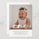Une simple invitation pour le premier anniversaire avec votre photo et le mot 'one' en haut dans une police de style calligraphie. Vous pouvez modifier tout le texte et ajouter votre propre photo.