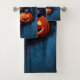 Une scène d'Halloween éffrayante avec une sorcière squelette. Son corps osseux est orné d'une cape noire en lambeaux et d'un casquette pointu de sorcière qui flotte dans le vent. Placés autour d'elle sont des citrouilles brillants de différentes tailles, dont les visages sculptés ont l'air joyeux et effrayant en même temps. Certains citrouilles émettent une lumière chaude et orange. La palette de couleurs est composée de tons foncés comme le noir et le bleu, combinés avec des accents lumineux d'orange