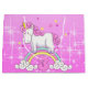 A cute unicorn stands on a colourful rainbow in a pink and sparkly sky.