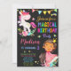 This unicorn invitation features happy little unicorn, dancing cute little princess in pink dress, coloured garland, some flowers and rainbows around.