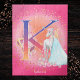 This magical princess design has a fairy tale castle with a princess wearing a flowing blue gown. The princess has a cute unicorn and there are flowers and a treasure box. The pretty background is a bright pink. For a special personalized touch, there's a monogrammed letter in the middle and a place to add a first name or other text at the bottom. This whimsical fantasy design is perfect for your special little girl and makes a great custom birthday, Christmas, or other holiday gift. See full collection for additional letter options.