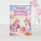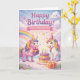 Featuring two adorable unicorns celebrating with a birthday cake, presents, and a rainbow-filled sky, this card includes the cheerful message: