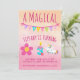 A unicorn themed birthday invitation for your three year old, this design features a pink watercolor background with "A Magical Birthday" written in lovely graphics and font. Underneath is sample text "Tiffany is turning" with a "3" lit birthday candle in blue. Purchase your unicorn birthday invitation today!