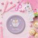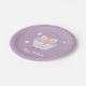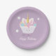 Paper Plate with a smiling, cartoon, unicorn cupcake. The design includes stars and the words "Happy Birthday". The words are customizable. (The gold tone of the unicorn horn is non-foil)