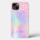 A trendy holographic, iridescent background with unicorn and rainbow pastel colours in pink, purple, rose gold, mint green. Decorated with faux glitter drips in rose gold, pink, purple and a rainbow coloured unicorn. Purple coloured letters. Personalize and add your name. The name is written with a modern hand lettered style script with swashes. To keep the swashes only delete the sample name, leave the spaces or emoji's in front and after the name.