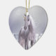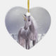 A snow white unicorn with a long flowing mane and tail and a golden horn stands in the gently falling snow in this digital artwork by artist Jayne Wilson.