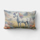 Un coussin à lombaire montrant une image rêveuse d'une licorne blanche avec une crinière arc-en-ciel debout dans un champ de fleurs. Dans l'arrière - plan se trouvent des montagnes majestueuses. Le cadeau parfait pour donner à ceux qui aiment les licornes magiques et mystiques. Contient du contenu génératif.