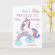 A cute and sweet magical unicorn birthday card design featuring a colourful unicorn standing on a cloud and Rainbow with a background of shooting stars and hearts.The card has the wording - Have a Magical Birthday in a colourful font . A sweet, cute and magical design for a little girl who is turning three years old. A lovely 3rd birthday card for your daughter, granddaughter or niece. Can be personalized by amending the from name at the bottom of the card then change the message inside which currently reads , Have a Magical 3rd birthday, lots of love XX The Age can also be amended.
