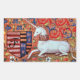 Classy ,elegant fleur de lys and heraldic motives,floral swirls red blue,flowers with a white sitting unicorn ,digital elaboration from an ancient medieval miniature .