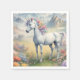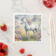 A paper napkin showing a dreamy image of a white unicorn with a rainbow mane standing in a field of flowers. In the background are majestic mountains. The perfect gift to give those who love magical and mystical unicorns. Contains generative content.