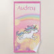 Unicorn Personalized Beach Towel. Background in hot pink (you can change this colour by selecting it, then select edit and you can change colour) or we will gladly assist.