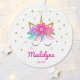 This personalized unicorn ornament features a cute whimsical unicorn face design with flowers, stars and faux gold glitter. Personalize it with a name and year.