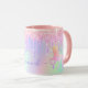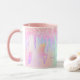 A trendy holographic background with unicorn and rainbow pastel colours in pink, purple, mint green. Decorated with drips in pink and purple and two unicorns. Personalize and add a name, written with a modern hand lettered style script with swashes. Purple coloured letters. To keep the swashes only delete the sample name, leave the spaces or emoji's in front and after the name.