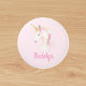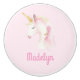 A soft pink background decorated with a cute unicorn face in white and pink. Personalize and add a name, pink letters.