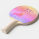 A fantasy dreamy golden unicorn in a landscape of violet, pink and peach colours. Soft pastel colours in violet, pink, peach and warm yellow. Template for your name and monogram letter. White and violet coloured letters.