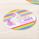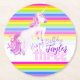 Third birthday party coasters, featuring a whimsical mythical unicorn watercolor painting and colourful rainbow stripes. Personalize with your own choose of name. Currently reads Happy Birthday Taylor three. Unique drawing, watercolor painting art and graphic design by Sarah Trett www.sarahtrett.com for www.mylittleeden.com