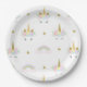 Unicorn paper plates with pretty pastel unicorns and rainbows on a white background.