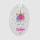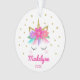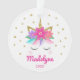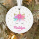 Ce ornement de licorne personnalisé présente un design de visage de licorne blanc mignon avec des fleurs, des étoiles et une parties scintillant en faux or. Personnalisez-le avec un nom et une année.
