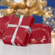 Elegant and cute personalized Christmas wrapping paper with Santa in his sleigh pulled by a unicorn, various snowflakes, and Xmas trees decorated with silver baubles. Perfect for little kids, especially little girls who like unicorns. With the greeting "Merry Christmas!" (which you can customize) in stylish cursive script / calligraphy, along with a custom name. On a Xmas red background.