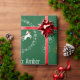 Elegant and cute personalized Christmas wrapping paper with Santa in his sleigh pulled by a unicorn with golden and red glitter in his mane and tail, various snowflakes, and Xmas trees decorated with silver baubles. Perfect for little kids, especially little girls who like unicorns. With the greeting "Merry Christmas!" (which you can customize) in stylish cursive script / calligraphy, along with a custom name. On a Xmas green background.