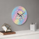 This cute and colourful custom wall clock features a beautiful illustration of a unicorn and pastel coloured rainbow, over a rainbow gradient background. Faux gold glitter accents the top and bottom portions. Little stars in matching colours surround the rainbow. A banner is printed above the unicorn with a sample name printed below in an elegant purple script font. The hours are printed in a soft pink glitter design. You can personalize the clock to include your own custom name or text.