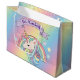 This cute and colourful custom gift bag features a beautiful illustration of a unicorn and pastel coloured rainbow. over a rainbow gradient background. Faux gold glitter accents the top and bottom portions. Little stars in matching colours surround the rainbow. A banner is printed above the unicorn with a sample name printed below in an elegant purple script font. You can personalize the gift bag to include your own custom name or text.