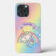 This cute and colourful custom phone case features a beautiful illustration of a unicorn and pastel coloured rainbow over a rainbow gradient background. Faux gold glitter accents the top and bottom portions. Little stars in matching colours surround the rainbow. A banner is printed above the unicorn with a sample name printed below in an elegant purple script font. You can personalize the phone case to include your own custom name or text.