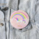 Unicorn pin with magical blue, gold glitter and rainbow colours! Text in gold with a rainbow unicorn against a soft pastel pink background. Change the background colour if you like!