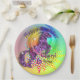 A fun magical personalized birthday party paper plate with a purple sparkle effect Unicorn jumping through a colourful rainbow, so cute and a favourite with young girls; just customize it with your birthday girl's details or text of your choice.