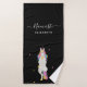 Une jolie licorne qui fait des poses de yoga. Un arrière - plan noir chic. Avec le texte : Namaste écrit avec un script de style écrit main blanche. Personnalisez et ajoutez votre nom.