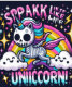 Une caricature de licorne dansant sur un arc-en-ciel avec des étincelles et des nuages.