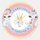 Cute unicorns with a golden crown and flowers making a personalized party sticker for girls birthday. +++++++++++++ Insert your kid's name and age!