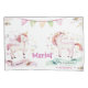On front: Two cute unicorns in love, boho style. With boho style feathers and watercolored flowers as decor, bunting flags, the text: be unique and I don't believe in humans. Template for the childs name, pink letters. Soft pastel colours in pink, green and yellow. White background.