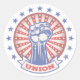 A pro-union t-shirt design with a raised fist in a circle of red, white and blue stars and stripes, and with "union" in an arched banner at the bottom. T-shirts, sweats, buttons, mugs, gifts.