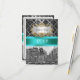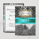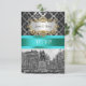 Customizable Invitations and accessories with a black and white view New York City's Union Square Park in the winter, lightly covered with snow. It also features a black damask pattern against a silver grey background, an aqua / teal ribbon and a white label in your choice of a silver or gold look frame.