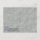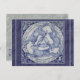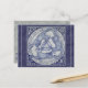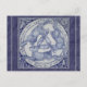 In rich blue shades on grey /white, my interpretation of an ancient design features three rabbits or hares sharing just three ears and chasing each other in a circle. My art was originally painted on glazed and kiln fired tiles as a four-tile mural. The traditional folk verse in the border reads, "Rabbits three and ears as few / Yet each rabbit has its two." This ancient design is found in old art and architecture throughout Europe and the middle east. The corners of the tiles are decorated with stylized birds and floral motifs inspired by chinoiserie blue and white pottery. The background is textured blue with thin grey stripes. The postcard's reverse is textured light grey. A unique, whimsical yet elegant postcard, suitable for any occasion. Original artwork & design by Tuzi Williams.