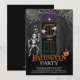 Cute Halloween invitation featuring a black front house door with a halloween wreath embellished with spider webs, jack o lanterns, bats & ghost. Adorned with a white skeleton & contemporary typography. Easy to personalize with your halloween haunted house information. Don't forget to customize with YOUR HOUSE NUMBER next to the door!