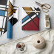 Modern geometric pattern in colour combination of dark red, black, white, blue, and mustard brown.