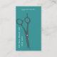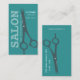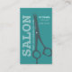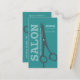 Modern cutting edge artistic illustration business card with hair salon stylist cutting scissors. Customized Blue green, soft blue and grey colours with edgy vertical layout gives a trendy stylish visual identity to this bold layout template business card design. A bold salon appointment option for your women's beauty spa business.