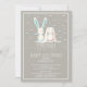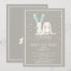 Stylish twin baby girl & baby boy bunny shower invitation with pretty pink & blue flowers set on a grey background.