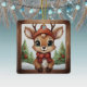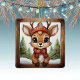 Unique reindeer rustic square ceramic ornament features a brown wooden frame, Christmas scene with cute baby forest animal deer with antlers in a cartoon graphic art style wearing a hat and scarf, standing in the foreground. Background includes wintry Xmas trees and winter snow landscape, completing the holiday season charm of this woodland wildlife doe character illustration decor, making a great gift. Fawn lover design on front and back. No matter how the decoration turns, it always looks festive and complete.