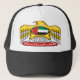 It consists of a golden falcon (Hawk of Quraish) with a disc in the middle, which shows the UAE flag and seven stars representing the seven Emirates of the federation. The falcon has 7 feathers also representing the 7 Emirates. The falcon holds with its talons a red parchment bearing the name of the federation in Kufic script.