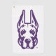 This design is a close-up of the University at Albany Great Dane mascot head. The illustration uses bold purple outlines with detailed shading in grey for the Great Dane's face, highlighting its angular features. The eyes are sharp, and the expression conveys alertness and strength. Accents of gold appear on either side of the dog's jaw, adding a touch of warmth to the otherwise fierce look. The ears are upright and pointed, reinforcing the logo's sense of readiness and authority. The design is minimal yet powerful, ideal for branding UAlbany’s athletic identity.