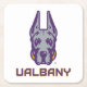 The University at Albany Great Dane mascot logo features a stylized depiction of a Great Dane's head. The dog is illustrated with sharp, bold lines in purple and grey, giving it a fierce, confident expression. The ears stand tall, symbolizing alertness and strength. Underneath the Great Dane head is the word "UAlbany" written in bold, blocky golden letters outlined in purple, reinforcing the university's branding. This design represents UAlbany's sports teams, highlighting power, loyalty, and determination.