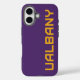 The University at Albany wordmark features bold, geometric typography in purple with gold outlines. The text is written in all capital letters, forming a strong and modern style that emphasizes the university's identity. The angular lines and sharp edges of the font create a sense of power and professionalism. The gold outline adds a touch of prestige and visibility, making the wordmark stand out on both light and dark backgrounds. This design is perfect for branding athletic teams, merchandise, and university-related media.
