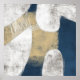 A large abstract shape in navy blue covers the canvas edge to edge with cutouts revealing a textured white background. A worn, textured beige area sits over the blue shape while white lines twist like rope in a dynamic finish to the piece.