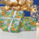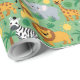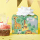 Unrolled and flat views of gift wrap featuring a colorful pattern of smiling lions, giraffes, zebras, and elephants on a green background. Playful and cheerful.