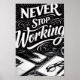 This striking black-and-white magazine-style design captures the essence of dedication and perseverance through its bold typography and clean visual composition. The phrase “Never Stop Working” stands at the centre in an artistic, decorative style, symbolizing continuous effort and an unbreakable mindset.
