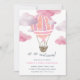 Up, up, and away! Our sweet kids birthday invitations feature a pink watercolor hot air balloon flying through fluffy pink clouds. Personalize with your birthday party details beneath. Cards reverse to solid pale pink.